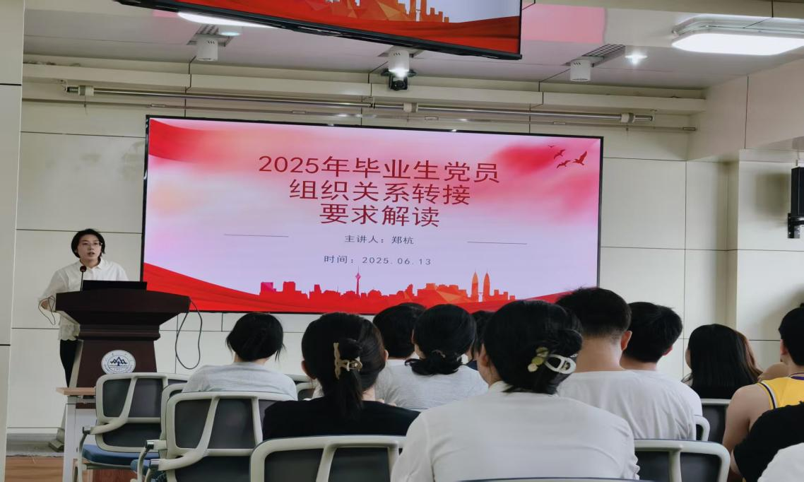 会议最后,学院党务秘书郑航党务秘书郑杭老师就毕业生党员组织关系转接工作进行了详细部署和说明。会议内容涵盖预备党员转正、档案管理、组织关系转接流程及特殊情况处理等方面,为毕业生党员提供了全面指导。她特别提醒毕业生党员:“步入职场后,要积极主动对接党组织,确保组织关系落地,避免成为'口袋党员’或'失联党员’。”